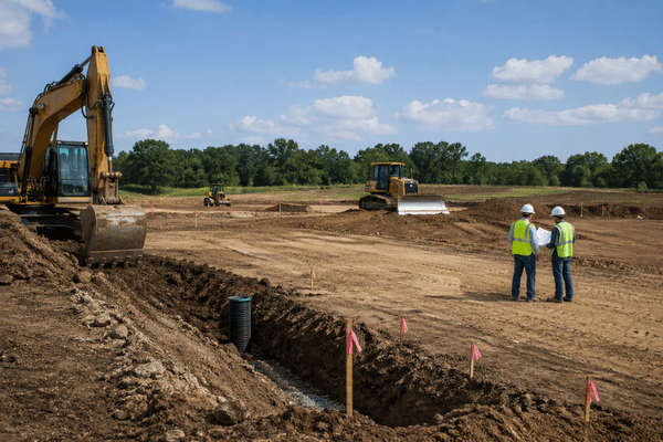 Construction excavation services cover site clearing, rough grading, foundation and utility trenching, dewatering, compaction, and final grade. The goal is a stable, build-ready pad handed off to the next trade.